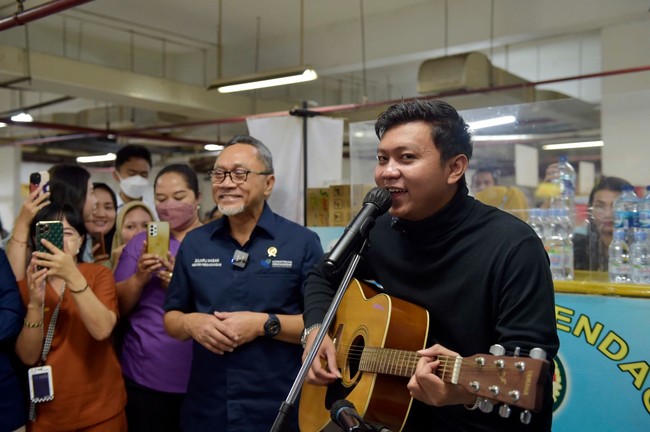 Sementara itu, pada Rabu (11/1) siang, Denny Caknan datang ke kantor Kementerian Perdagangan (Kemendag) untuk bernyanyi.