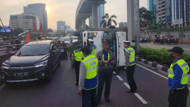 Polisi mengevakuasi truk kecelakaan hingga terguling di Jalan Gatot Subroto, Jakarta Selatan (Jaksel). Lalu lintas arah Semanggi macet.