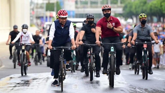 Presiden Joko Widodo (Jokowi) menghabiskan pagi dengan bersepeda pagi ini. Jokowi bersepeda di kawasan hari bebas kendaraan bermotor atau car free day (CFD) Sudirman-Thamrin, Jakarta.