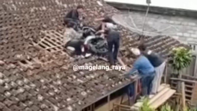 Sebuah video pengendara motor nyangkut di atap rumah warga di Magelang viral di media sosial. Ternyata peristiwa ini terjadi di Desa Madyogondo, Kecamatan Ngablak, Kabupaten Magelang.