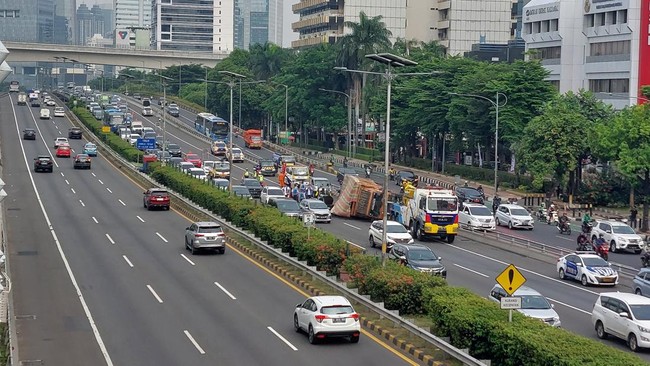 Badan truk yang mengalami kecelakaan menutup sebagian lajur jalan di Tol Dalam Kota. Muatan pasir juga terlihat tumpah di tepi jalan.
