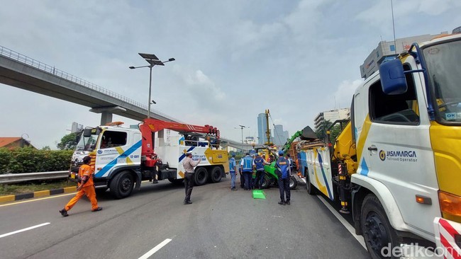 Lebih lanjut, petugas PJR Polda Metro terlihat bersiaga di lokasi mengatur arus lalu lintas di Tol Dalam Kota.