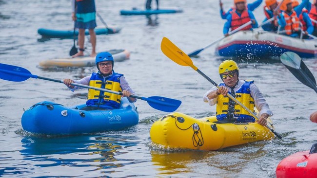 "Kita bisa main kano, sekarang kita pakai helm. Helm biru untu saya," kata Bima sambil memakai helm.
