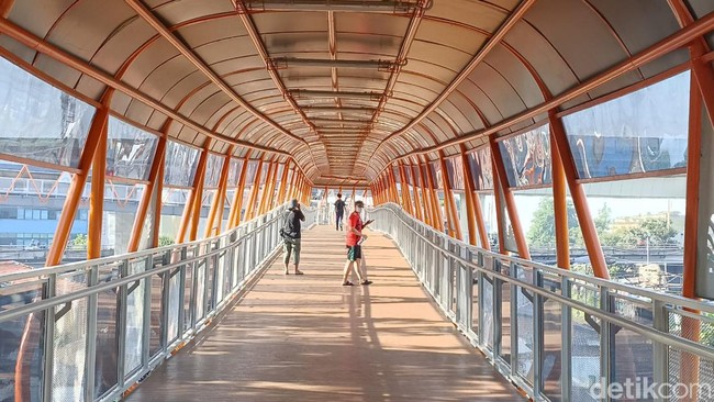 detikcom menyusuri Skywalk Kebayoran Lama pagi ini, Sabtu (21/1/2023). Jembatan layang yang memiliki panjang 500 meter itu memiliki dominasi warna coklat dan oranye.