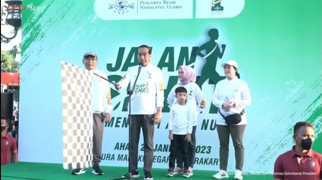 Jalan sehat Jokowi dalam rangka menuju satu abad NU disiarkan akun YouTube Sekretariat Presiden, Minggu (22/1/2023). Jokowi tampak ditemani Ibu Negara Iriana Joko Widodo dan cucunya Jan Ethes, serta Wali Kota Solo Gibran Raka Buming Raka.