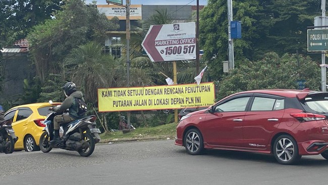 Spanduk itu bertulisan 'Kami Tidak Setuju Dengan Rencana Penutupan Putaran Jalan di Lokasi Depan PLN Ini'.