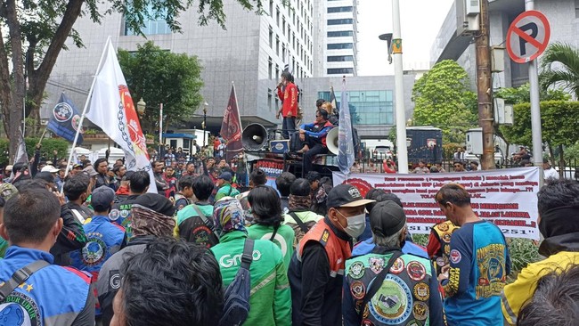 Massa aksi yang terdiri atas driver ojek online (ojol) menggeruduk gedung DPRD DKI Jakarta. Massa aksi itu mendesak Pemprov DKI membatalkan rencana kebijakan jalan berbayar atau electronic road pricing (ERP).