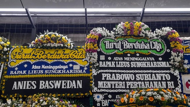 Pantauan detikcom di lokasi pada Rabu (23/1/2023), karangan bunga berdatangan di rumah duka Grand Heaven. Karangan bunga tersebut datang dari pejabat hingga kolega Lieus.