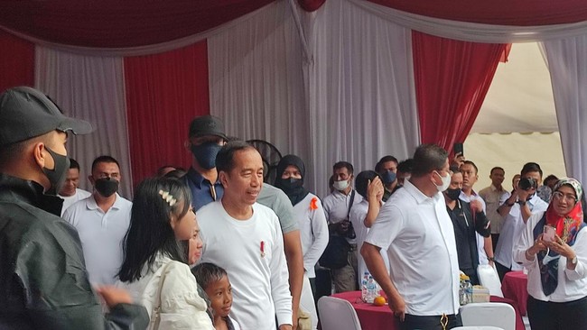 Pantauan detikcom di lokasi, Sabtu (28/1/2023), Jokowi datang mengenakan kaus putih. Keluarga Paspampres yang hadir dalam kegiatan tersebut terlihat meminta foto bersama Jokowi.