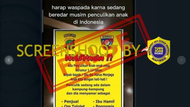 "Harap Waspada karena sedang beredar musim penculikan anak di Indonesia. Waspada!! Ada penculikan anak-anak yang berumur 1-12 tahun. Bapak-bapak/Ibu-ibu harus menjaga anak kita dengan hati-hati! Penculikan sedang ada dalam kampung-kampung dan dia menyamar sebagai: Penjual, om telolet, ibu hamil, pengemis," demikian bunyi informasi hoax tersebut.