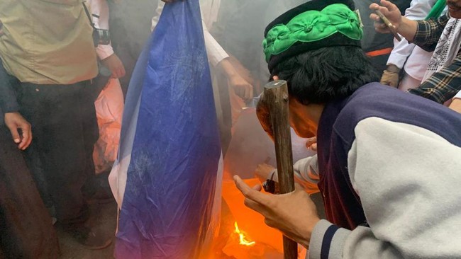 Pantauan detikcom di depan Kedubes Belanda, Jalan HR Rasuna Said, Jakarta Selatan, Senin (30/1/2023), pukul 18.02 WIB, massa tampak membakar bendera Belanda dan poster Rasmus Paludan serta Edwin Wagensveld.