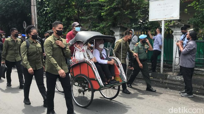 Dilansir detikJateng, Selasa (31/1/2023), becak yang ditumpangi Iriana dikawal Paspampres. Rombongan Iriana Jokowi disebut meninjau sejumlah industri bakpia.
