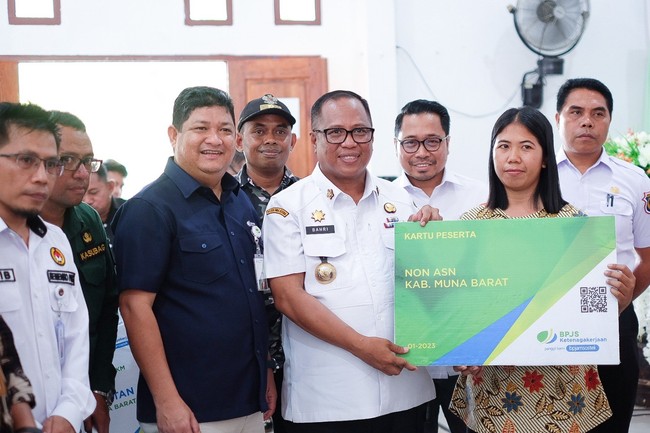 Penghargaan tersebut diberikan langsung oleh Direktur Kepesertaan BPJS Ketenagakerjaan Zainudin kepada Pj. Bupati Muna Barat, Bahri di Kantor Bupati Muna Barat, Rabu (1/2). Dalam kesempatan tersebut, Zainudin juga secara simbolis menyerahkan kartu kepesertaan serta santunan kepada pekerja di Muna Barat.