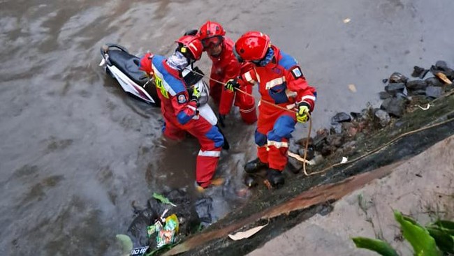 Sebuah video yang merekam petugas damkar mengevakuasi seorang ibu-ibu yang tercebur di kali di Tebet, Jakarta Selatan (Jaksel), viral di media sosial. Ibu-ibu itu tercebur ke kali bersama sepeda motornya.