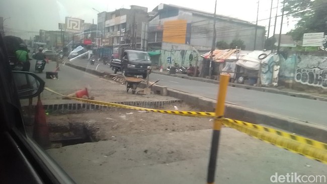 Salah satu titik di Jalan Dewi Sartika, Ciputat, Tangerang Selatan (Tangsel), amblas. Kemacetan parah terjadi imbas perbaikan jalan yang sedang dilakukan.