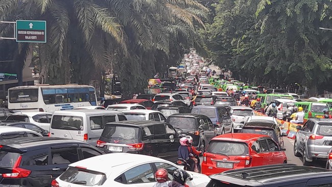 Antrean kendaraan menyambung hingga Jl Otista dan pintu masuk Kebun Raya Bogor yang berseberangan dengan Jl Surya Kencana.