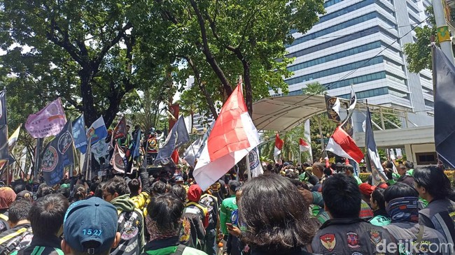 Pantauan detikcom di lokasi, Rabu (8/2/2023), massa aksi memadati jalanan depan Balai Kota DKI Jakarta, Jalan Medan Merdeka Selatan, Jakarta Selatan, sejak pukul 12.50 WIB. Mereka berasal dari berbagai komunitas ojol di seluruh wilayah Kota Jakarta.