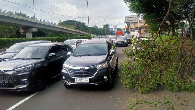 TMC Polda Metro mengunggah foto di lokasi. Terlihat ranting pohon yang patah itu menutupi sebagian ruas jalan tol.