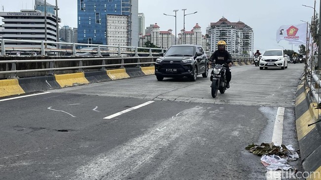 Tampak pula garis berwarna putih di TKP yang mulai memudar. Tidak terlihat petugas kepolisian di sekitar flyover Grogol.