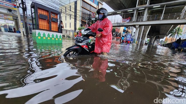 Pantauan detikcom, banjir terjadi sekitar pukul 07.30 WIB akibat hujan deras, Sabtu (11/2/2023). Tinggi air hampir selutut orang dewasa.