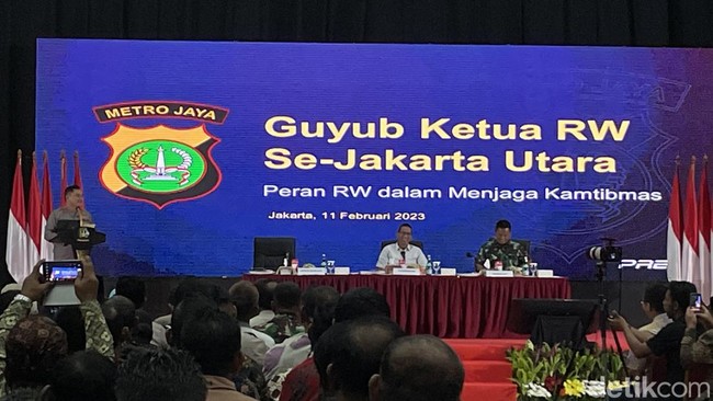 Polda Metro Jaya menggelar pertemuan bersama ketua rukun warga (RW) se-Jakarta Utara. Pertemuan itu turut dihadiri oleh Penjabat (Pj) Gubernur DKI Jakarta Heru Budi Hartono dan Pangdam Jaya Mayjen TNI Untung Budiarto.
