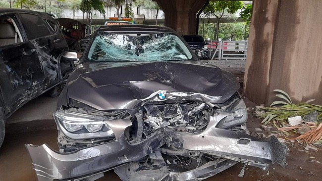Mobil BMW bernopol B-1507-WBI yang melaju melawan arah dan menabrak pemotor hingga tewas di Jalan Raya Fatmawati, Jakarta Selatan (Jaksel), ringsek parah di bagian depan. Mobil tersebut terparkir di area Unit Kecelakaan Lalu Lintas (Laka Lantas) Satlantas Polres Metro Jaksel, Jagakarsa.