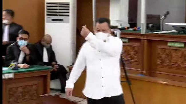 Kuat sebelumnya berpose finger heart saat proses pemeriksaan saksi, Senin (5/12/2022). Saat itu, Kuat menunjukkan pose jari cinta ala Korea itu ke arah pengunjung sidang.