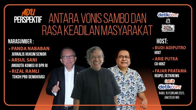 Adu Perspektif malam ini mengangkat topik 'Antara Vonis Sambo dan Rasa Keadilan Masyarakat' bersama Panda Nababan (jurnalis hukum senior), Arsul Sani (anggota Komisi III DPR), dan Rizal Ramli (tokoh prodemokrasi). Acara disiarkan secara langsung Rabu, 15 Februari 2023, pukul 20.00 WIB di detikcom.