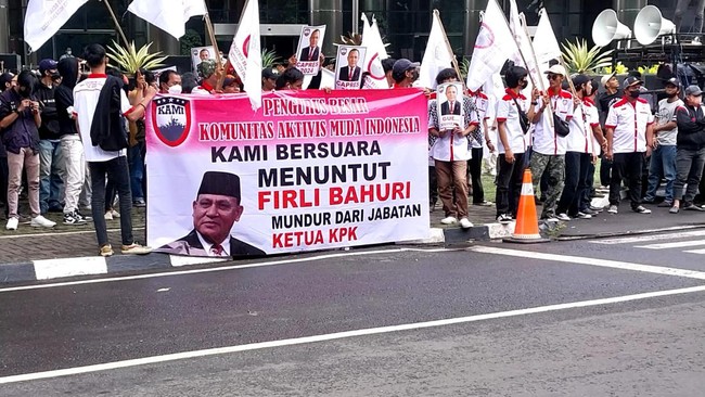 Terlihat mereka membawa bendera hingga poster yang berisi tuntutan kepada Firli. Salah satu poster bertulisan 'Kami Bersuara Menuntut Firli Bahuri Mundur dari Jabatan Ketuw KPK'.