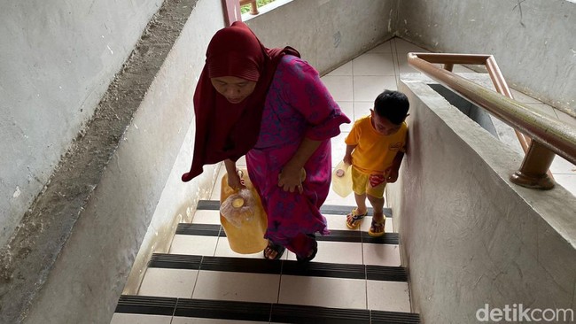 "Paling dapat dua galon (galon isi ulang) namanya kita lantai 3 ya kuatnya segini doang sisanya buang air kita ke bawah (toilet)," ungkap Warti.