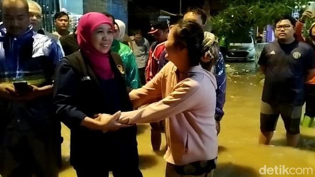 Gubernur Khofifah Indar Parawansa mendatangi lokasi banjir imbas dua tanggul jebol di Gresik. Khofifah mendatangi korban banjir, baik yang masih di rumah maupun di pengungsian.