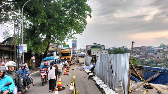 "Iya betul longsor, tanah di bawah jembatan Cikereteg longsor, jembatan ini sebenarnya sedang dalam proses perbaikan oleh pihak PUPR, tapi kembali longsor. Untuk situasi saat ini arus kendaraan sedang dilakukan buka tutup di seputar TKP longsor jembatan Cikereteg," kata Kanit Turjawali Satlantas Polres Bogor Ipda Ardian Novianto, Jumat (24/2/2023).