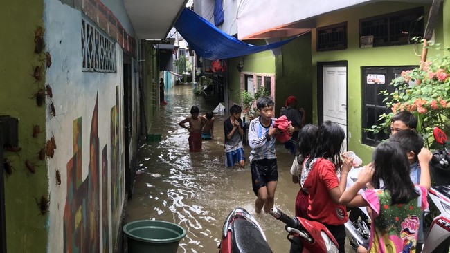 Saat orang dewasa setinggi sekitar 160 cm berjalan ke dalam air banjir itu, terlihat air menggenangi hingga dadanya. Sementara anak-anak tampak bermain dengan ban karet di tengah banjir.