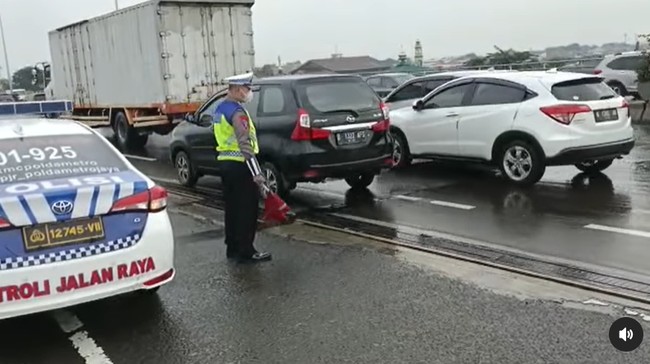 "Polri Sat PJR Dit Lantas PMJ melakukan pengaturan di Km. 03 Tol Dalam Kota Jatinegara arah Tj. Priok. Situasi arus lalu-lintas terjadi keterlambatan dikarenakan adanya jalan berlubang / rusak. Diimbau bagi pengendara berhati-hati ketika melintas," tulis TMC Polda Metro, Senin (27/2/2023).
