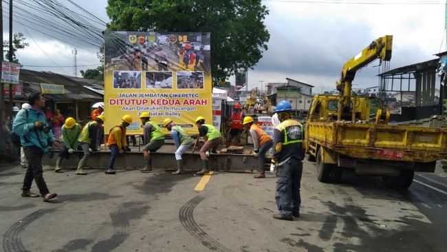 Jalan nasional akses Bogor-Sukabumi ditutup selama 14 hari imbas Jembatan Cikereteg Bogor amblas. Selama penutupan, akan membangun jembatan bailey sebagai jembatan darurat agar kendaraan bisa lewat