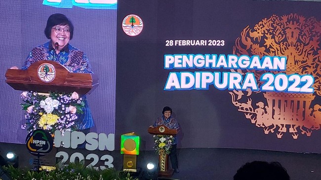 Menteri Lingkungan Hidup dan Kehutanan (LHK) Siti Nurbaya Bakar memberikan penghargaan Adipura kepada sejumlah kota dan kabupaten yang berhasil dalam mengelola kebersihan dan lingkungan. Penghargaan diberikan dalam gelaran puncak Hari Peduli Sampah Nasional (HPSN) 2023.