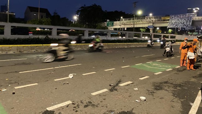 Massa dari kalangan buruh hingga mahasiswa demonstrasi menolak Perppu Ciptaker di depan gedung DPR/MPR, Jakarta, sudah membubarkan diri. Kondisi lalu lintas di depan gedung DPR, Jalan Gatot Soebroto, kembali normal.