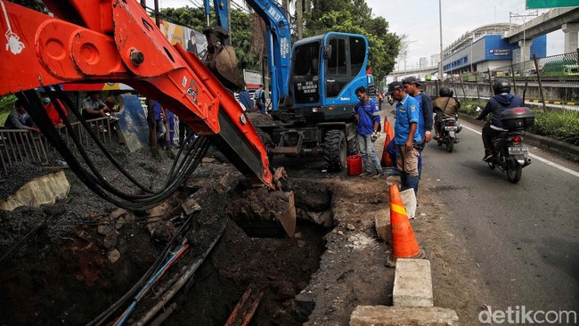 TMC Polda Metro Jaya juga mengunggah video laporan petugas di lokasi. Terlihat satu unit ekskavator berada di titik jalan amblas.