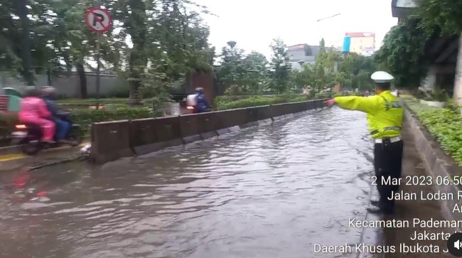 "07.06 Genangan air di Jalan Lodan raya Jakut arah barat tepatnya depan Pos Pol Bintang Mas ketinggian air sekitar 10-15 Cm," tulis TMC Polda Metro.