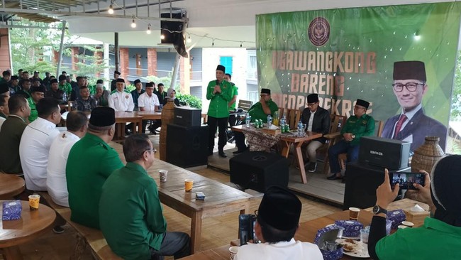 Keluaga besar Partai Persatuan Pembangunan (PPP) bersama Menteri Pariwisata dan Ekonomi Kreatif (Ekraf) Sandiaga Salahuddin Uno menggelar kegiatan ngawangkong atau ngobrol di kawasan obyek wisata Ciremailand Glamping, Desa Cisantana, Kecamatan Cigugur, Kuningan.