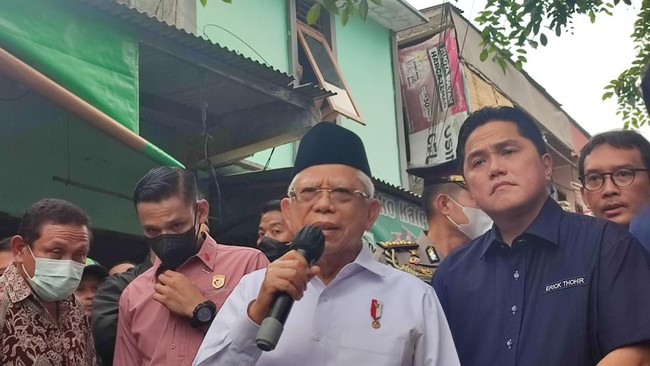 Wapres Ma'ruf Amin meninjau permukiman lokasi kebakaran Depo Pertamina Plumpang, Jakarta Utara. Wapres Ma'ruf Amin berharap Depo Pertamina Plumpang direlokasi ke wilayah pelabuhan.