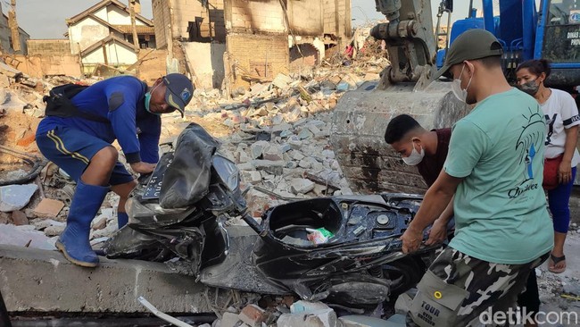 Putra Supriadi (28) tampak mengangkat sebuah motor yang tertimpa puing-puing bangunan yang terdampak kebakaran Depo Pertamina Plumpang, Jakarta Utara. Dia dibantu bersama sejumlah warga lainnya.