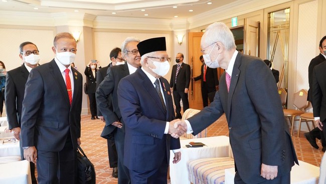 Sementara Wapres Ma'ruf Amin didampingi Duta Besar (Dubes) RI untuk Jepang dan Federasi Mikronesia Heri Akhmadi, Kepala Sekretariat Wakil Presiden Ahmad Erani Yustika, Deputi Bidang Dukungan Kebijakan Pembangunan Ekonomi dan Peningkatan Daya Saing Guntur Iman Nefianto, Staf Khusus Wapres Bidang Komunikasi dan Informasi Masduki Baidlowi, Tim Ahli Wakil Presiden Farhat Brachma, Konsul Jenderal RI Osaka Diana Emilla Sari Sutikno Konjen RI Osaka, serta Plt. Direktur Eksekutif Komite Nasional Ekonomi dan Keuangan Syariah Taufik Hidayat.