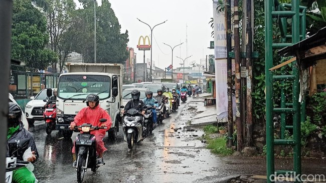 Macet diperparah oleh kondisi cuaca yang hujan. Pengendara pun memperlambat laju kendaraannya.