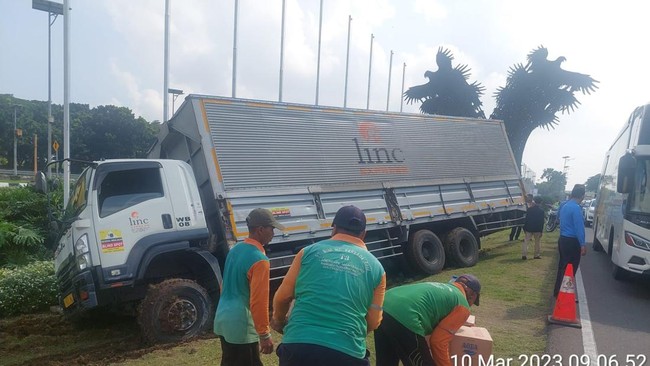 "Penanganan petugas gabungan Sat Lantas Bandara Soetta, Jasa Marga dan Angkasa Pura II kecelakaan truk yang mengalami pecah ban di Jl P1 Patung Garuda Bandara Soekarno-Hatta," tulis TMCPoldaMetro.