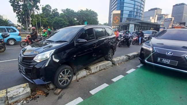 Satu unit mobil menabrak pembatas jalur sepeda di Jalan Sudirman, Jakarta Pusat (Jakpus). Mobil tersebut nyangkut di beton pembatas jalur sepeda.