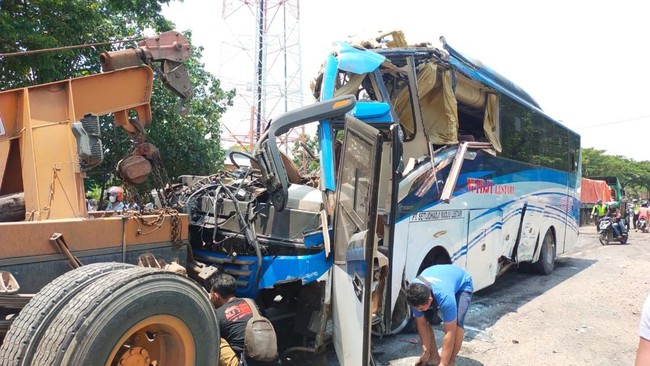 "Jadi dua kendaraan bus yang menyalip dengan truk dari timur ke barat laka hadap-hadapan, kemudian satu kejadian satu kendaraan dia salip barat ke timur karena dia memaksa kembali ke jalur dia menabrak ke truk sampai terguling tersebut," Dandy melanjutkan.