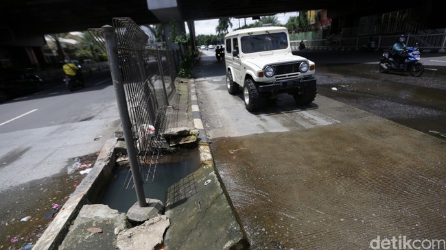 detikcom melihat air muncul di drainase yang meluber ke badan jalan. Tutup drainase dari beton terlihat terbuka. Lokasinya masih di dekat JPO.