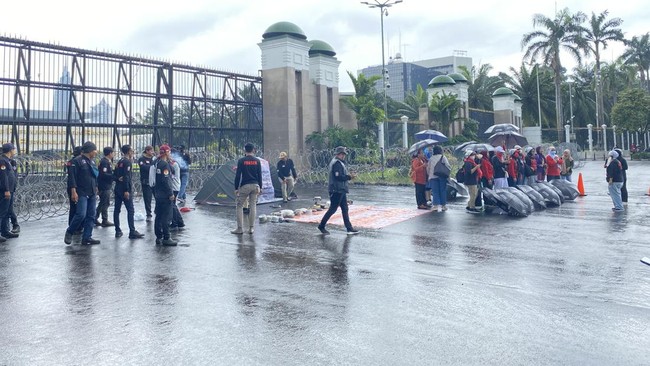 Pantauan detikcom di depan gedung DPR, Jakpus, Selasa (14/3/2023), terlihat kawat berduri masih terpasang. Ada juga sekumpulan pembantu rumah tangga (PRT) memasang tenda di depan gedung DPR.