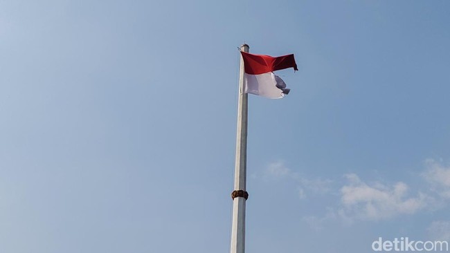Berdasarkan pantauan detikJabar, Senin (13/3/2023), bendera berkibar ditiup angin. Terlihat cukup jelas robekan pada bagian bendera itu ada di sambungan kain berwarna merah dan putih.